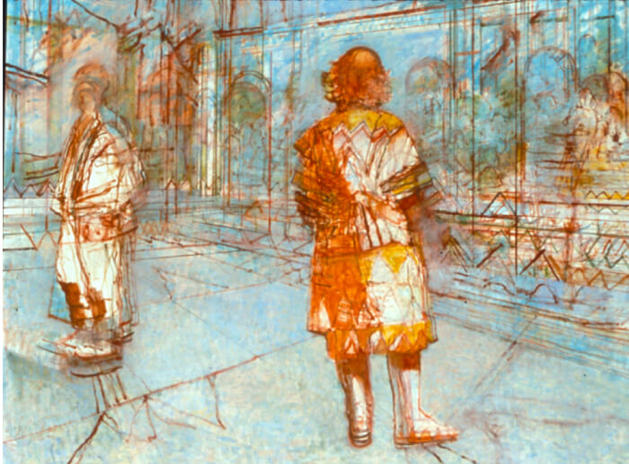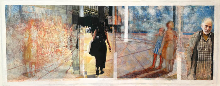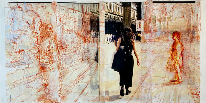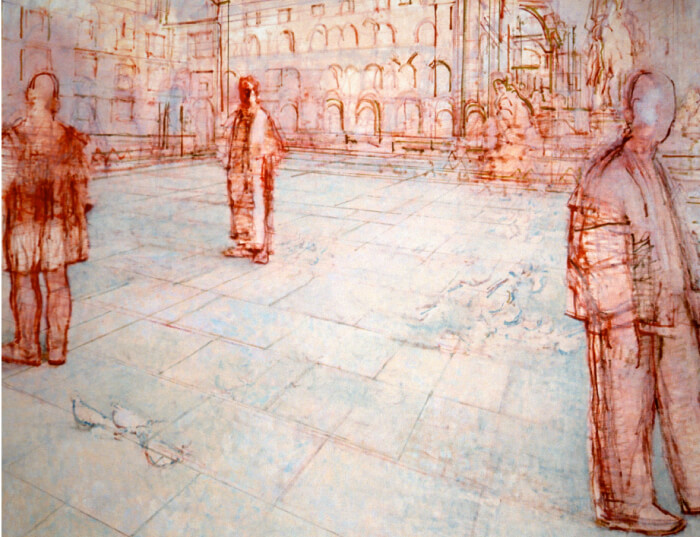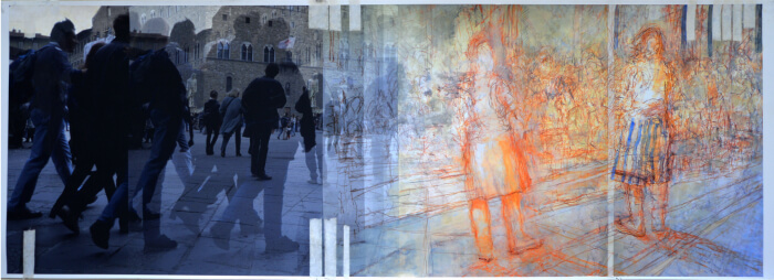 While the theme/subject of the work is the city square, an additional subject of the project is the art-making process itself and the integration of new digital technology with traditional forms of art.